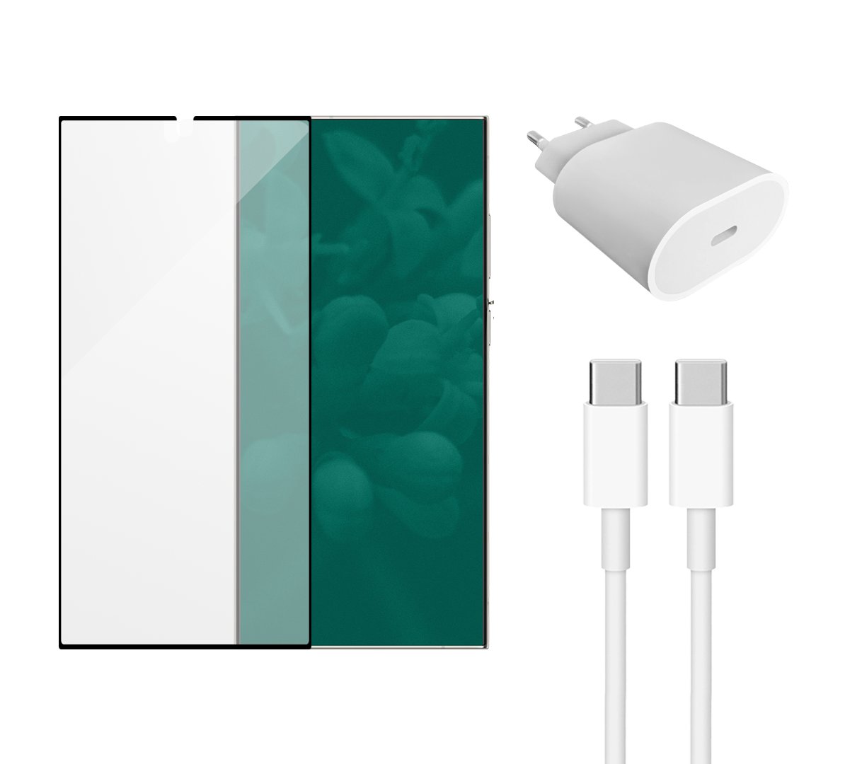 Introducing our Ultimate Phone Protection Bundle: a premium combination of our high-quality Fast Charger + Cable and the renowned PanzerGlass™ Screen Protector. Keep your phone safe from drops and scratches with the PanzerGlass™ made from top-quality tempered glass, preventing over 90% of display breakages. Charge quickly and efficiently with our fast charger and 1-meter USB-C to USB-C cable, ensuring seamless connection for your devices. Enjoy a smooth touch experience with the anti-fingerprint coating and easy, bubble-free installation. Plus, benefit from our 12-month warranty for reliable charging. Upgrade your device protection and charging today!